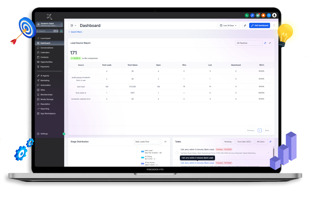 Stop losing potential clients due to slow follow-up. KorePulse AI contacts every new enquiry within minutes, by SMS, email, and voicemail automatically. It then books appointments, collects reviews, and tracks each opportunity through to completion.